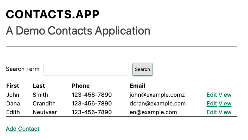To start our journey into Hypermedia-Driven Applications, we are going to create a simple contact management web application called Contact.app. We will start with a basic, “Web 1.0-style” Multi-Page Application (MPA), in the grand CRUD (Create, Read, Update, Delete) tradition. It will not be the best contact management application in the world, but it will be simple and it will do its job.